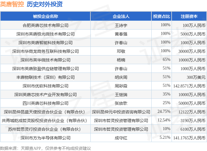 本站消息众盈易配,根据天眼查APP显示,英唐智控(300131.SZ)新增一起对外投资事件,被投资公司为合肥英唐芯技术有限公司,法定代表人王诗宇,投资占比为100%。该公司从事计算机、通信和其他电子设备制造业,注册资本为100万人民币。目前,英唐智控共存在对外投资14项,详见下表: