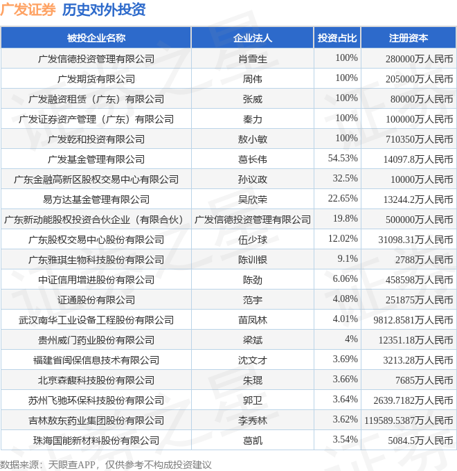 本站消息,根据天眼查APP显示,广发证券(000776.SZ)新增一起对外投资事件,被投资公司为广州华立科技股份有限公司财盛配资,法定代表人苏本立,投资占比为0.61%。该公司从事计算机、通信和其他电子设备制造业,注册资本为14669.2万人民币。目前,广发证券共存在对外投资142项,投资占比前20的项目见下表: